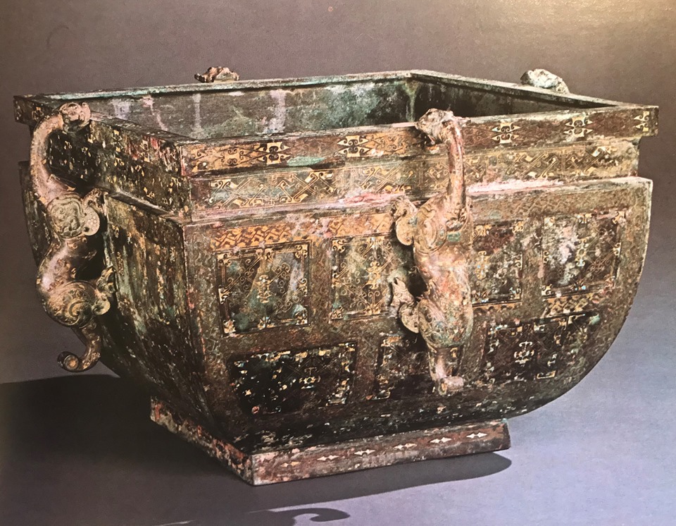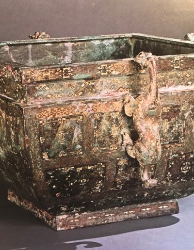 Much of the Chinese dragon iconography is ornamental in nature. Decorative home furnishings , elaborate paintings fill Oriental museums. Stand alone dragon statutes are more rare. But these are generally more realistic and more commonly match up closely with known types of dinosaurs. Below is a celadon (jade green) Yuandiao Dragon figure from the Shang Dynasty (about 2000 BC). It is currently housed at China’s Changzhou Museum. This piece was brought to our attention by Chris St. James, who pointed out the similarity to a Ceratosaurus dinosaur. Unlike the T-rex, with two fingers, the Ceratosaurus had four fingers on each hand. Another fascinating Chinese artifact is the Late Eastern Zhou Sauropod (Fang Jian) ornamental box. Displaying a long neck and, this depiction is compelling likeness to a Brachiosaurus. (Fong, Wen ed., The Great Bronze Age of China, Metropolitan Museum of Art, 1980, p. 285.)