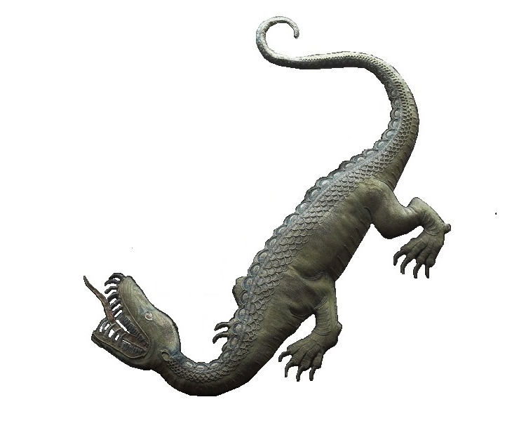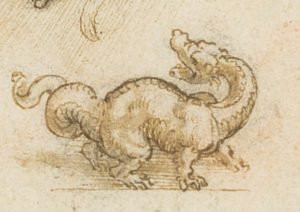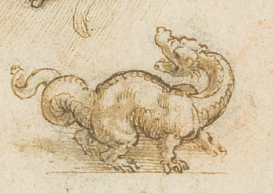 The famous Italian artist Leonardo Da Vinci was gifted in working various mediums. A pen and ink picture entitled “Cats, Lions, and a Dragon” was drawn by him circa 1517–1518. It is now part of the Royal Collection housed at Buckingham Palace. The cats are all drawn with the incredible realism and detail that comes from personal observation. The single dragon bears a remarkable likeness to a small sauropod dinosaur. But dinosaurs would not be discovered in Europe for another three centuries! What did Leonardo base his dragon drawing on? The only odd feature is the coiled tail. There is an artist’s note at the bottom of the drawing: “Of Flexion and Extension”. Perhaps there was a species of small sauropod known in the Middle Ages that could coil its tail. Or maybe the unusual tail posture was based upon reports of common lizards that can coil their tail and use it for grasping.