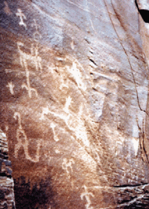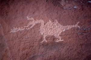 On the right is shown a photo of one of the curious dragon petroglyphs near Middle Mesa at the Wupatki National Park. This particular petroglyph is called “Puff the Magic Dragon,” and appears to be a depiction of a fire-breathing dinosaurian. Though there is no certain way to date such petroglyphs, this carving is believed to be at least several hundred years old.