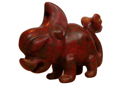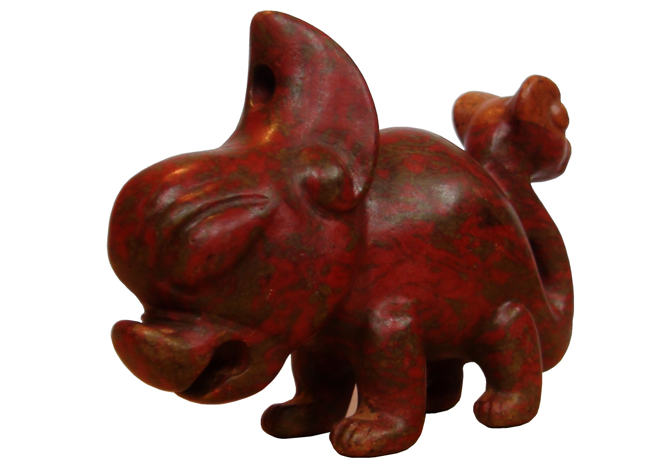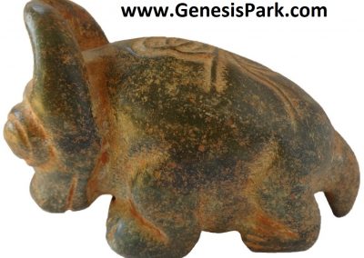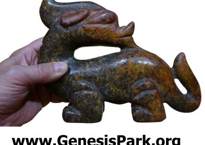 About 4,000 years ago, the Hongshan culture in China produced many wonderful jade dragon carvings (along with other clear animal representations). Over time these dragon productions became highly stylized and were especially popular as pendants. Most of these ornamental pieces barely resemble a large reptile, but some of the older dragon statues appear to be attempts at modeling certain dinosaurs. Notice the resemblance these jade dragons below bear to a small Protoceratops dinosaur. Some of the Hongshan dragons, like the piece below, have longer necks. They appear more like the ceratopsian Udanoceratops. All three of these ancient pieces are part of the Genesis Park collection.