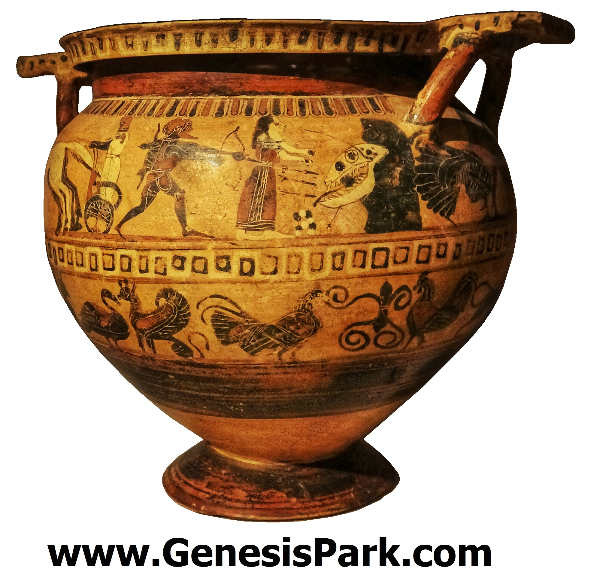The February 26, 2000 issue of Science News contained an article that commented on a Hesione vase artifact housed at the Boston Museum of Fine Arts (Hesman, 2000). On this ancient Greek vase are a series of somewhat unusual paintings, including one that portrays a monster with the head of a dinosaur. This pottery was created around 550 B.C. and depicts the Greek hero Herakles (Hercules) rescuing Hesione from this “Monster of Troy.” Forced to concede that it is an amazingly realistic dinosaurian depiction, Science News concluded that the paintings on this unusual vase simply prove that ancient people dug up and assembled fossils. But there is no evidence for such sophisticated Primitive Paleontologists.