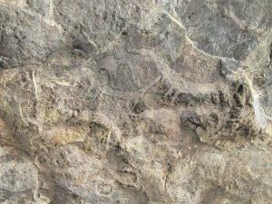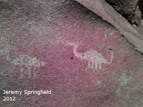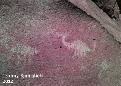 Next we consider some very special rock art. Petroglyphs are carved or chipped into the rock surface. Pictographs are merely painted onto the surface of the rock, rather than carved into it. The petroglyph below was discovered in 2012 by Jeremy Springfield on a trip to Hidden Mountain, just outside of Los Lunas, New Mexico. The drawing is located on an isolated, inaccessible ledge near a very clear deer petroglyph. What were the ancient Pueblo peoples intending to depict, if not a living dinosaurian creature that they knew from that region?