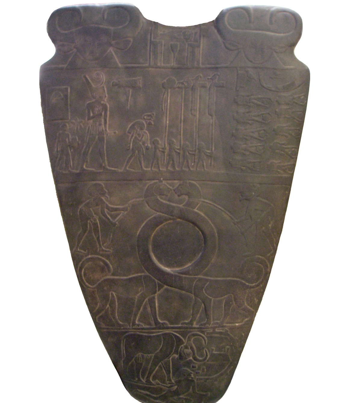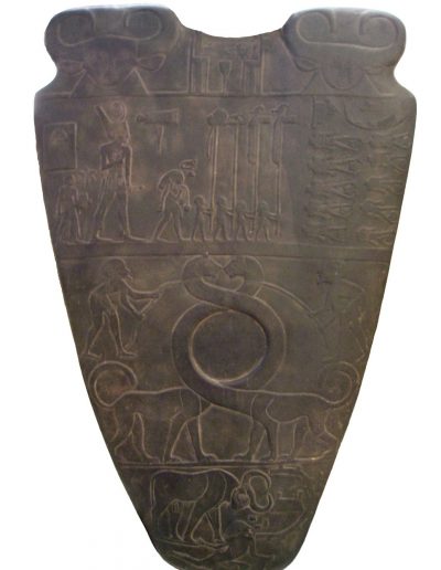 The January 2003 issue of National Geographic magazine presents an artifact described as a “cosmetic palette . . . from a cemetery of the first dynasties in Manshaat Ezzat.” These long-necked creatures displayed on page 78 fit the pattern of other ancient dinosaur-like depictions, including arching, muscular necks and stout bodies. This artifact depicts many lifelike animals (including a giraffe on the reverse). Next is displayed the famous Narmer Palette, which dates back to about 3,100 BC. It is from the ancient Egyptian capital of Hierakonpolis and shows the triumph of King Narmer with long necked dragons that appear to be in captivity. Then there is the Two Dog Palette from the same period. It is displaying a pair of “dinosaur-like” creatures along with numerous clear representations of living animals (clearly not drawn to scale!).