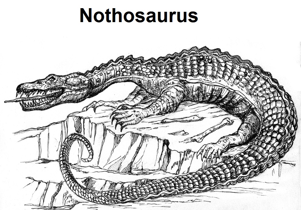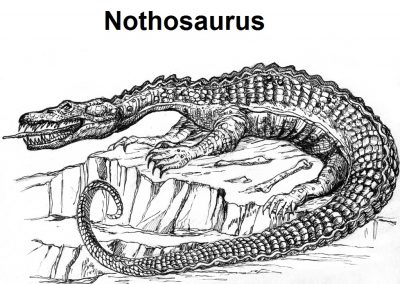 The slaying of a ferocious dragon by St. George is an extremely common motif in medieval art. According to the story, the fierce dragon ate all the town’s livestock and was demanding a human sacrifices. The lot fell upon the beautiful princess who then needed to save the town by giving up her life. But just before she was killed, brave George showed up, killed the dragon and rescued the princess. Various European artists interpreted the dragon differently, depending on local knowledge and lore. A wonderful medieval depiction is seen at the Palau de La Generalitat in Barcelona Spain. St. George’s Chapel contains an altar cloth illustrating St. George’s slaying of a dragon. The depiction bears an amazing likeness to the Nothosaurus, a semi-aquatic reptile (comparison below). Notice the correct-size, the crocodilian body style, and the fascinating long, curved teeth at the front of the jaw that gives way to finer dentition towards the back.