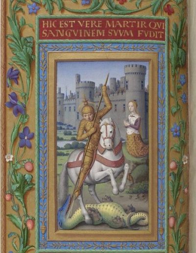 Yet another interpretation of St. George slaying the dragon is found in the Latin Book of Hours c. 1450 AD which is illuminated by the Master of Jean Chevrot and currently housed at the Morgan Library & Museum (below). Notice the Master’s attention to detail as seen in George’s armor, the birds in the sky, and the dragon’s genitals. The Fitzwilliam Museum contains another portrayal of St. George destroying the dragon (probably by Bruges) from a Latin Book of Hours c. 1490 AD. This colorful work from the Flemish School portrays a remarkably dinosaur-like dragon. Next we present an illustration of George leading a defeated dragon as seen in the book Huth Hours, published in the Netherlands c. 1480 (Image from the British Library). The monster has a curiously large stomach (perhaps gravid) and is web-footed. But note the accurate reptilian ear and dinosaurian neck.