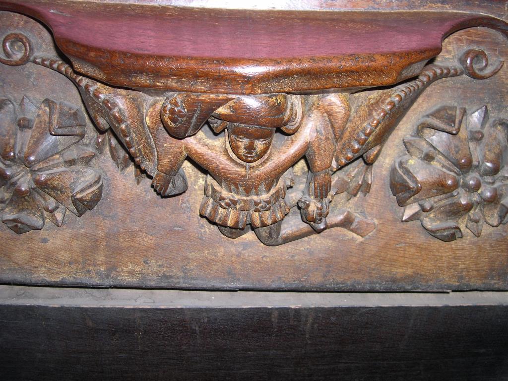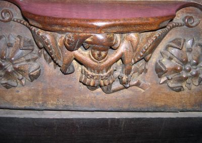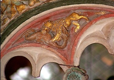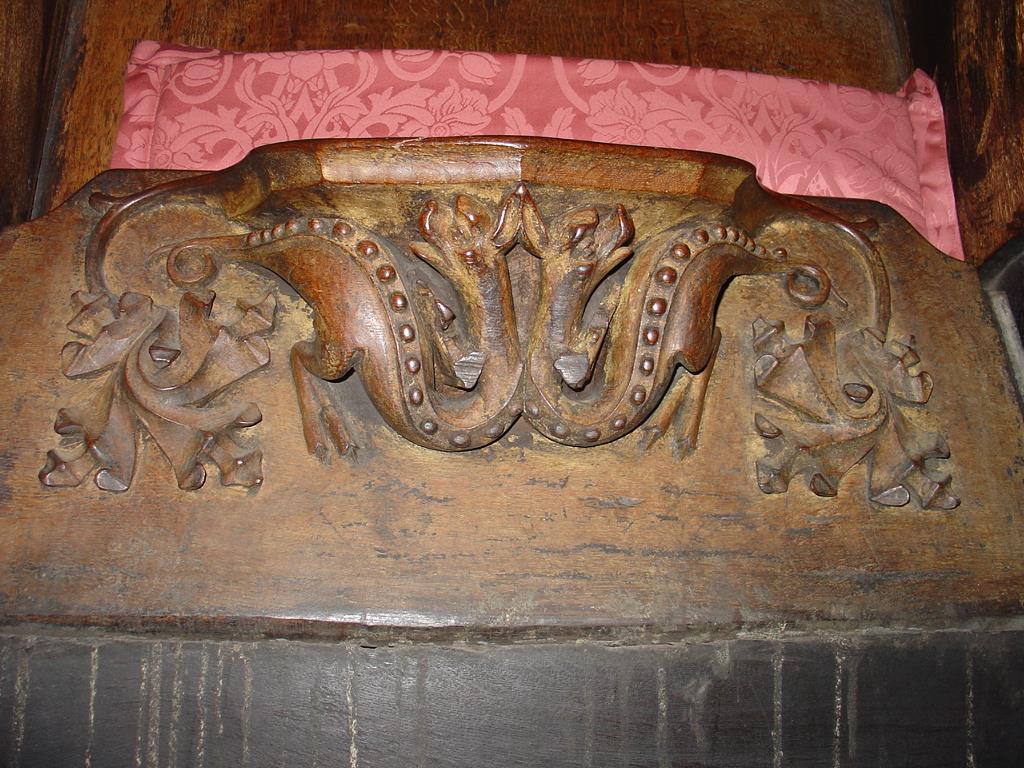 Choir stall railings and misericords (shelf-like seats for reclining while standing) in Medieval European churches are often adorned with ornate carvings. A common theme is the depictions of a dragon (symbolizing Satan) fighting a lion (symbolizing Christ). Below is one such depiction, showing a dragon that looks very much like a sauropod dinosaur, taken from St. Remigius’ Church. Other dragon scenes are also depicted. Notice the dragon eating a man as shown on a misericord from St. David’s Cathedral in Wales. The Carlisle Cathedral’s misericords showing twin dragons were carved in the 15th century.