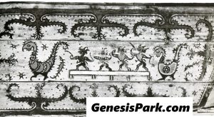 book Buried Alive by Dr. Jack Cuozzo (click to enlarge). Mammoth drawings are not unusual in such Neanderthal artwork, but the depiction of an apparent dinosaurian is quite remarkable. How would ancient peoples have known what a dinosaur looked like? Could it be that Noah’s descendants who were settling what would become Europe actually encountered dragons that had already established communities there? Some might suggest it is just happenchance that there drawing of a mythical animal resembles a dinosaurian. But that explanation becomes unlikely when we consider the number of ancient dinosaurian drawings below.