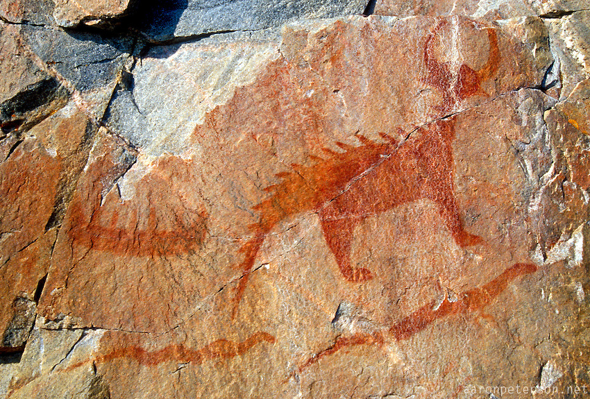 creature. Adrienne Mayor, an evolutionist, believes that the Sioux were weaving stories about fossils they encountered. (Mayor, Fossil Legends of the First Americans, 2005, pp. 235-237.) But the pictures and description bring to mind the dinosaur Ankylosaurus (shown below the native drawings) with a low slung body, long tail, heavy armor, and prominent multiple horns. A plated and horned creature has also been discovered in Ojibwa Indian art (see photo) on the Agawa Rock at Misshepezhieu, Lake Superior Provincial Park, Ontario, Canada.