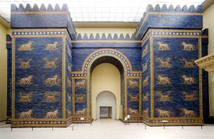 In 600 BC, under the reign of King Nebuchadnezzar, a Babylonian artist was commissioned to shape reliefs of animals on the structures associated with the Ishtar Gate. Many centuries later German archaeologist Robert Koldewey stumbled upon the blue-glazed brick and that gate was rediscovered in 1899. The animals appear in alternating rows with lions, fierce bulls (rimi or reems in Chaldean), and curious long-necked dragons (sirrush). The