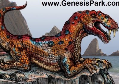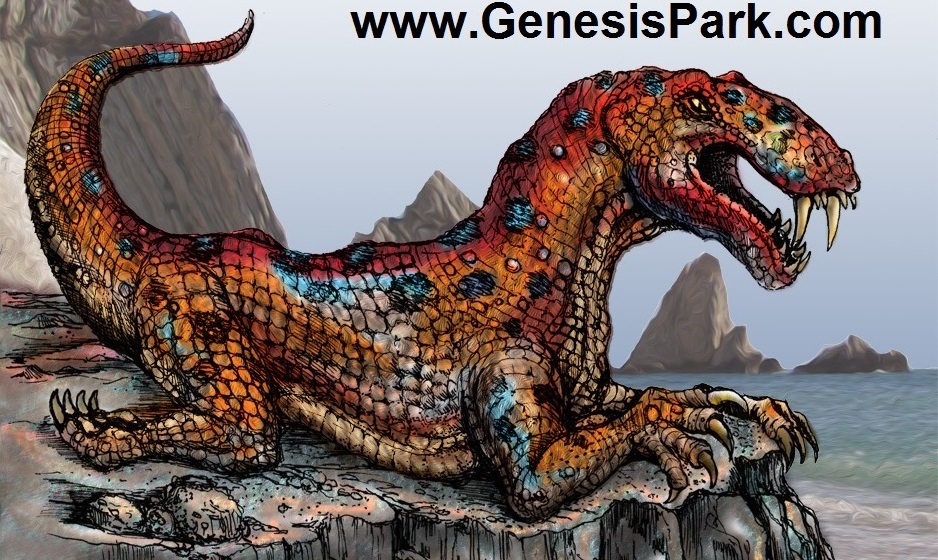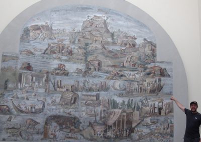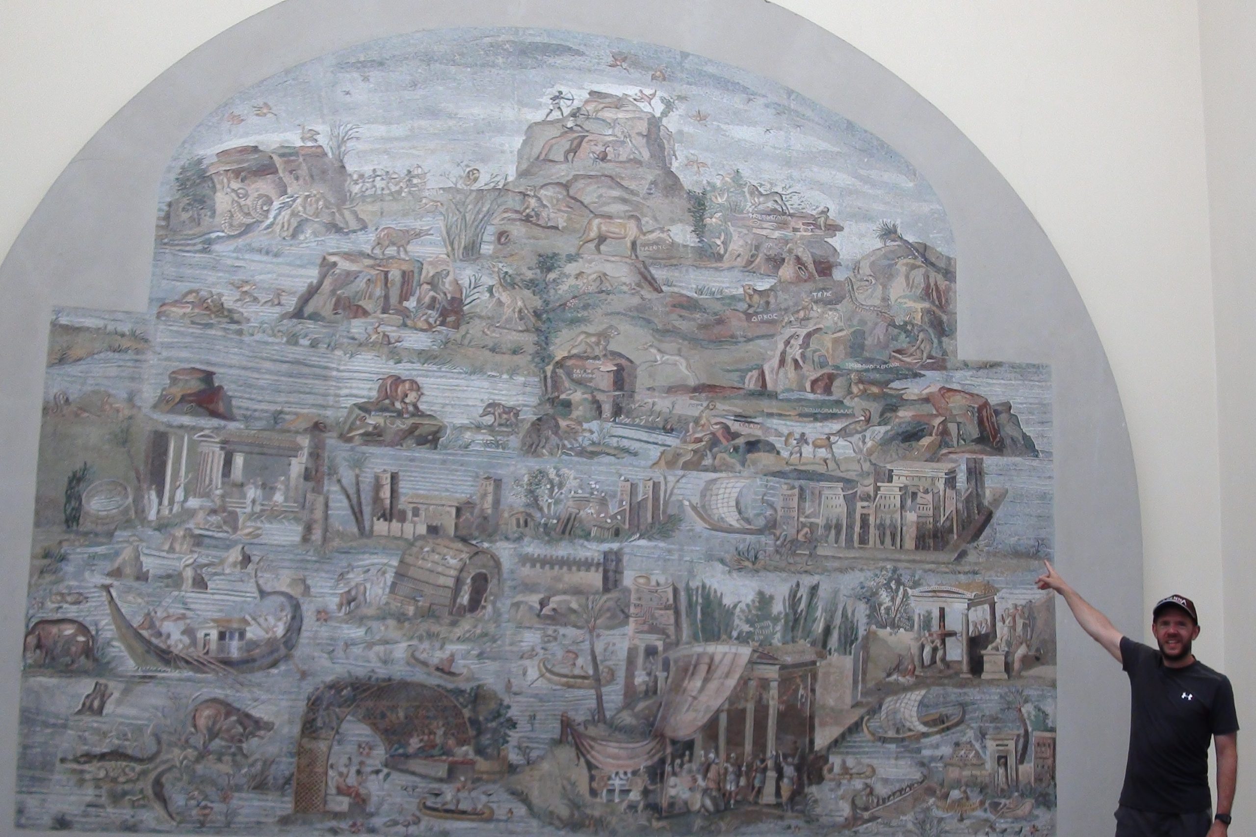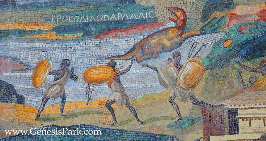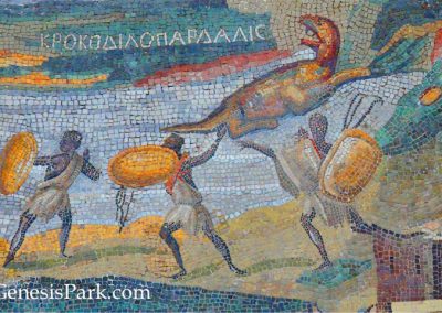 The Palestrina Mosaic is one of the most beautiful mosaics in the world. It dates to about 100BC. To get an idea of the size of it, note the photo of Dino Dave standing alongside the mosaic. But the lighting in the Palazzo Barberini does not due it full justice and the mosaic was probably even more vivid originally. Artist Richard Dobbs modified the mosaic image to enhance the colors, representing how it may have originally appeared. Also note Dobbs’ interpretation of the Palestrina reptile, based upon an Eotitanosuchus. Not only does the general morphology of Eotitanosuchus match the Palestrina creature, but its structural similarity to crocodilians matches the descriptive name “Crocodile-Leopard” written above it on the mosaic.
