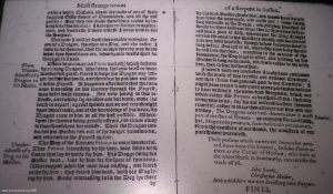…there is difcouer’d in our neighbour Countie of Suffes, a ftrange and monftrous Serpent (a thing moft noyfome and dreadfull to the Inhabitants…It is likewife difcouered to haue large feete, but the eye may be there deceaued, for fome fuppofe that Serpents have no feete, but glide uppon certaine ribbes and fcales which both defend him from the upper part of his throat unto the lower part of his bellie, and alfo caufe them to moue much more the fafter, for fo doth this by firft drawing together then floating forth, ridsway (as we call it) as faft as a man can run. It is of countenance very proud and at the fight or hearing of men or Cattell, will raife his necke upright, and feeme to liften and looke about with great arrogancey: There are likewife on either fide of it difcouer’d two great bunches fo big as a large foote ball, and (as some thinke) will in time grow to wings, but God (I hope) in their and our affiftance will go infruct and defend us that hee fhall bee deftroy’d before hee growe fo fledge.