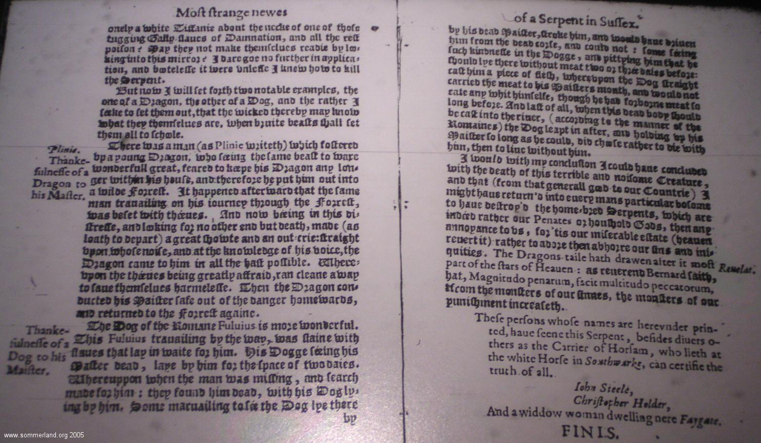“True and Wonderfull. A Difcourfe relating a ftrange and monftrous Serpent (or Dragon) lately difcouered, and yet liuing, to the great annoyance and diuers flaughters both of Men and Cattell, by his ftrong and violent poyfon, In Suffex two miles from Horfam, in a woode called St. Leonards Forreft, and thirtie miles from London, this prefent month of Auguft. 1614. With the true Generation of Serpents. Printed at London by Iohn Trundle.