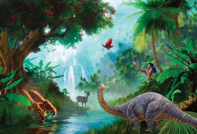 Some have speculated that the 7 Genesis Days of Creation are, in fact, long periods of time. This strained interpretation is an attempt to harmonize the Bible with the darwinian theory that dinosaurs lived millions of years before man evolved. But a straightforward reading of Genesis 1 and 2 leaves one with the distinct impression that the Author is discussing literal, 24-hour days (“evening and morning”). Moreover, the Jews and the Early Church for thousands of years have understood Genesis to be saying that God made everything in one week. If God intended to convey the idea that men were made millions of years after the dinosaurs, He could certainly have used a term like “ages” rather than “days.” The literal interpretation of Genesis is clearly affirmed by Jesus himself, who stated that man was made in the beginning (Mark 19:4), not millions of years after the beginning. Moreover, there is abundant evidence that men and dinosaurs did coexist.