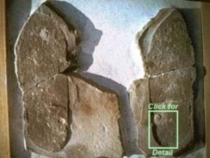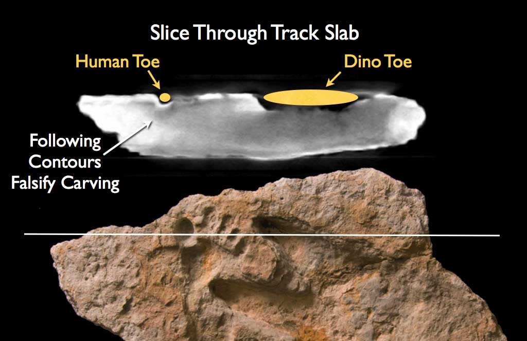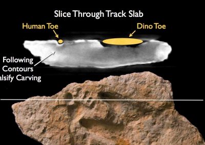 Over the years a large number of fossilized human tracks have been reported at various locations around the world. Some of these shed light on the coexistence of men and dinosaurs. The Paluxy River basin in Glen Rose Texas is the location of Dinosaur Valley State Park. Many dinosaur tracks have been found along the river and a large number have been excavated to preserve them from erosion. But there have also been human tracks found in this same rock layer. To the right is the Willet print, which was excavated from a limestone ledge near Dinosaur Valley State Park. Below to the left is the Feminine Print, a “human track inside a dinosaur track,” that was found in the Paluxy River area of Glen Rose, Texas. In the center is the Delk Print, which shows a human footprint intruded by a tridactyl dinosaur print. The Delk Track has been authenticated by spiral CT scan, which can verify that there is greater compression density below the tracks then elsewhere in the rock. The right picture shows what are called “following contours” revealed by the CT scan. These would not be there if the track was carved. These Paluxy “man-tracks alongside dinosaur-tracks” have been the source of considerable controversy over the years.