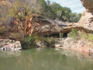 Could the rock concretion itself have been recently produced in the river? It does not seem that the rock matrix surrounding the hammer is of modern origin. There are none of the riverbed gravels embedded in the concretion. Instead the sandy composition matches the Cretaceous source rock upstream. A careful search of the river itself reveals that there are no unabraded shells available in the riverbed (and indeed very few shells at all). Moreover, the approximately ten shells in the rock matrix show no signs of having been reworked, which would indicate a more recent concretion. To the right is the Red River Waterfall area where the hammer was found. This artifact seems like it might well have been made before the Genesis Flood.