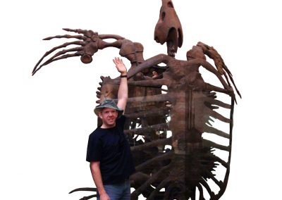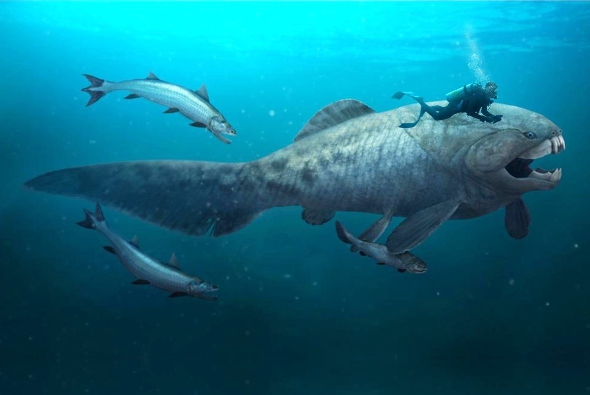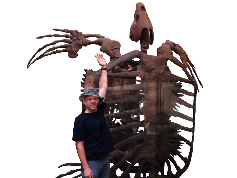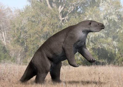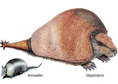 The picture to the right is of artist William Munns and his re-creation of the giant ape Gigantopithecus. Based on teeth and jaw fragments found in China, the great ape is thought to be 10-12 feet tall. Some people believe something like this creature still exist in the form of Big Foot. The giant South American armadillo grows to about 70 pounds. Compare this to the Glyptodont, the ancient South American armadillo that was as big as an automobile and weighed up to two tons! Then there is the example of the saber-toothed mesonyx. It was a wolf, somewhat larger than a Great Dane, and at least twice as large as a modern timber wolf. In 2017 an ancient wolf-sized otter species was unearthed in China. Siamogale melilutra is more than twice the size of the modern giant South American river otter.